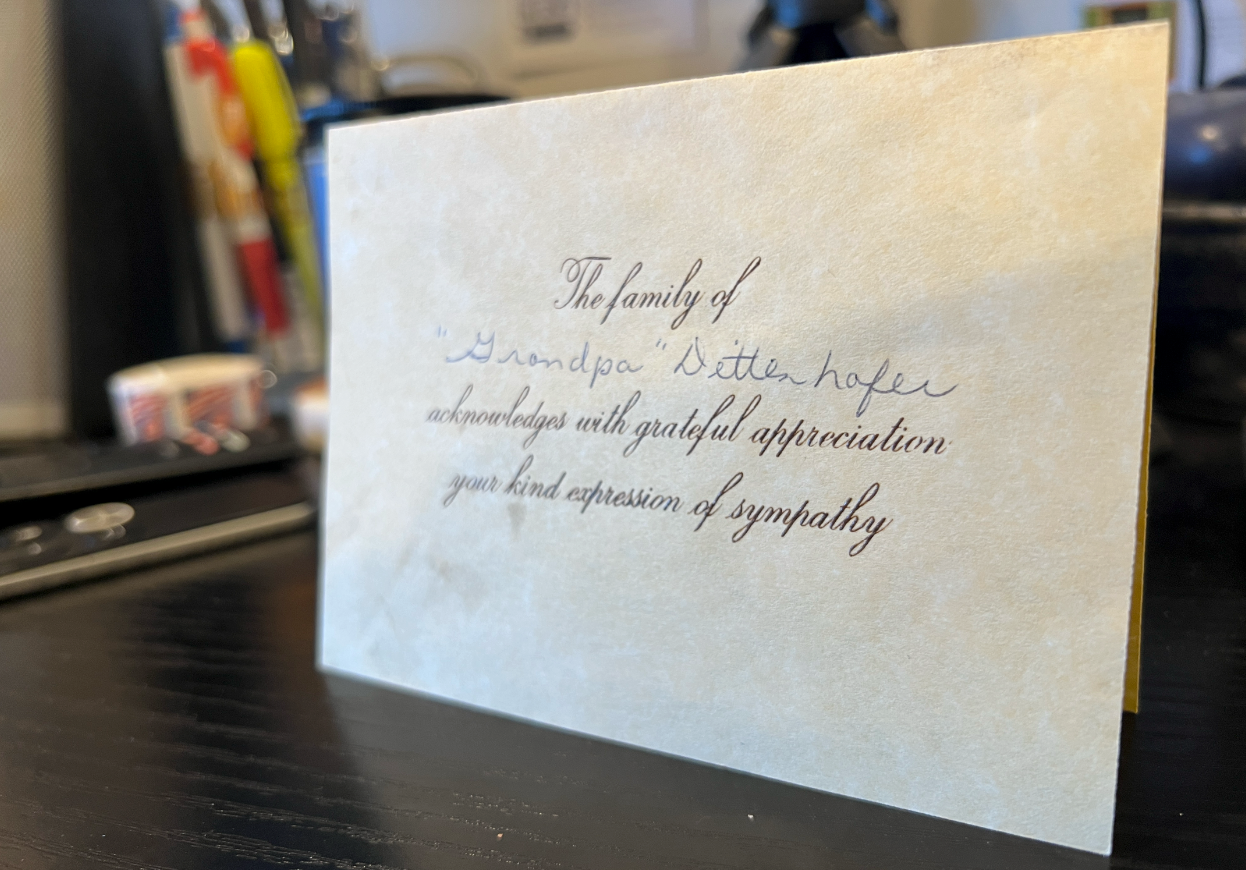 She wrote me this note after I had been a pallbearer at my grandfather “Bud” Dittenhafer’s funeral. That was 20 years ago, in 2002. Four years later, she too passed on after a life well lived. I came across the note while getting out Christmas decorations… The handwriting is the spitting image of my mom Peggy’s handwriting. Between the topic of the note, the author, and the immediate connection between multiple generations of family, a flood of emotion washed over me. Grief. Loss. Legacy. Gratitude. Joy...